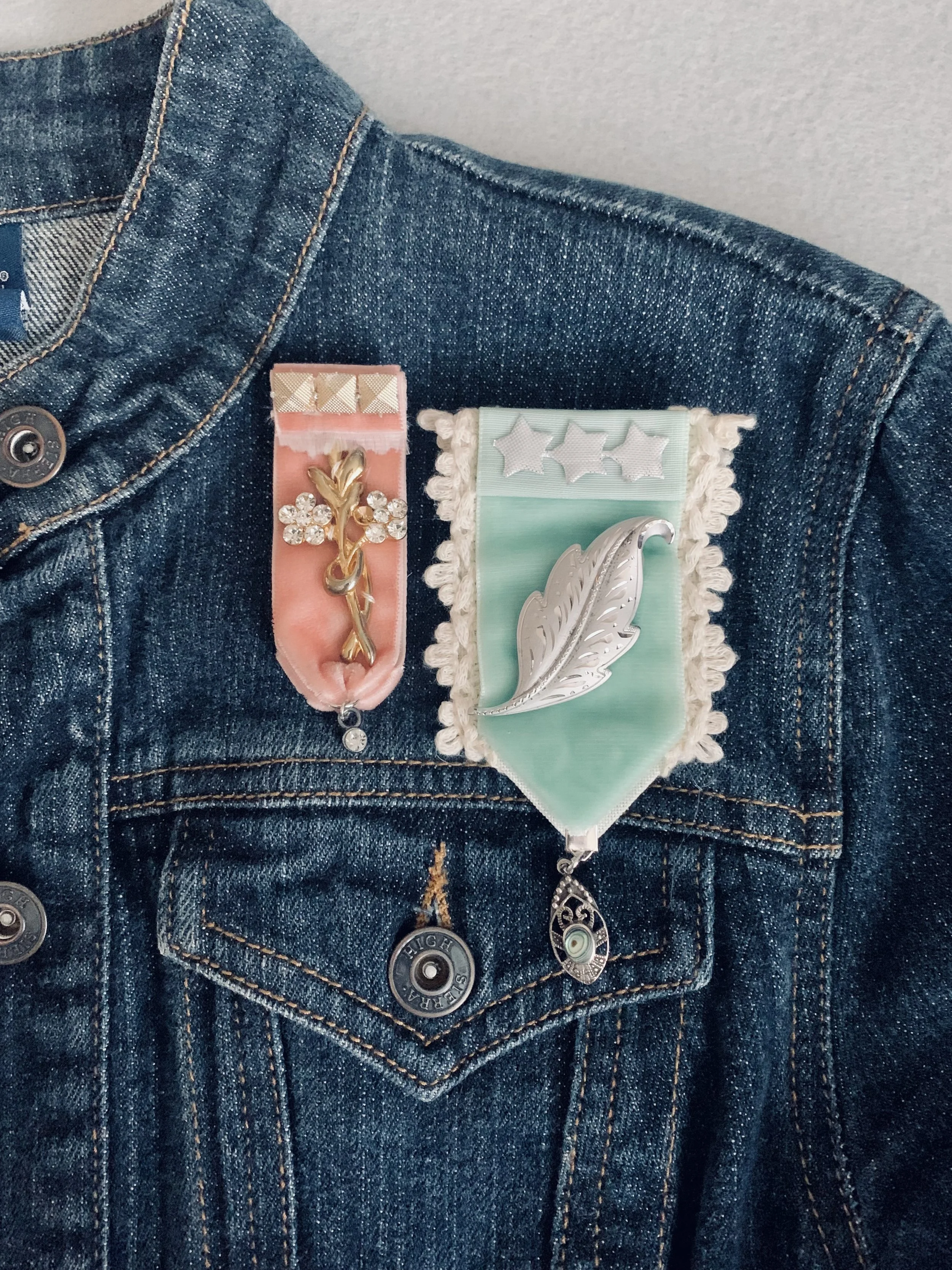Shero Medals are made with upcycled velvet/ satin/ grosgrain ribbons, broken jewelry and repurposed vintage brooches. They attach with a felt backed pin.